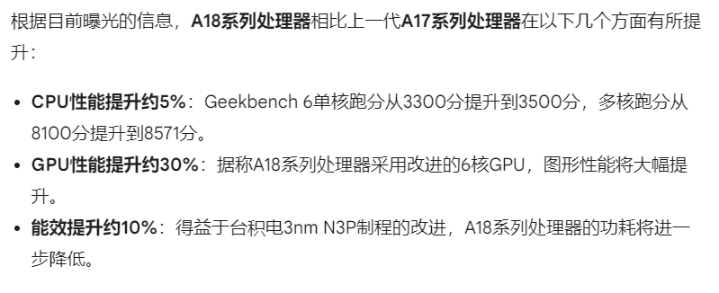 处理器方面,此前曝光的A18系列处理器在传统性能上的提升其实并不大,从数据上看,多核及单核的提升都在10%以内,只有GPU性能较为亮眼,提升约30%。