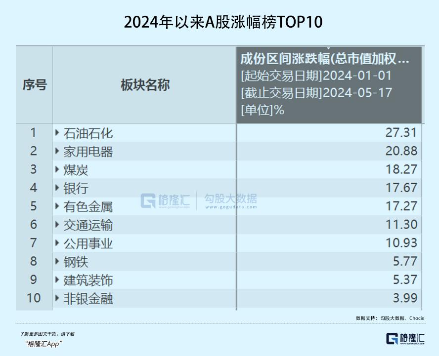 2024年以来,A股价红利值板块迎来了超额回报。其中,银行板块整体大涨17.7%,排名31个申万行业第4名,仅次于石油石化、家用电器以及煤炭,远超沪深300指数同期7.2%的市场表现。