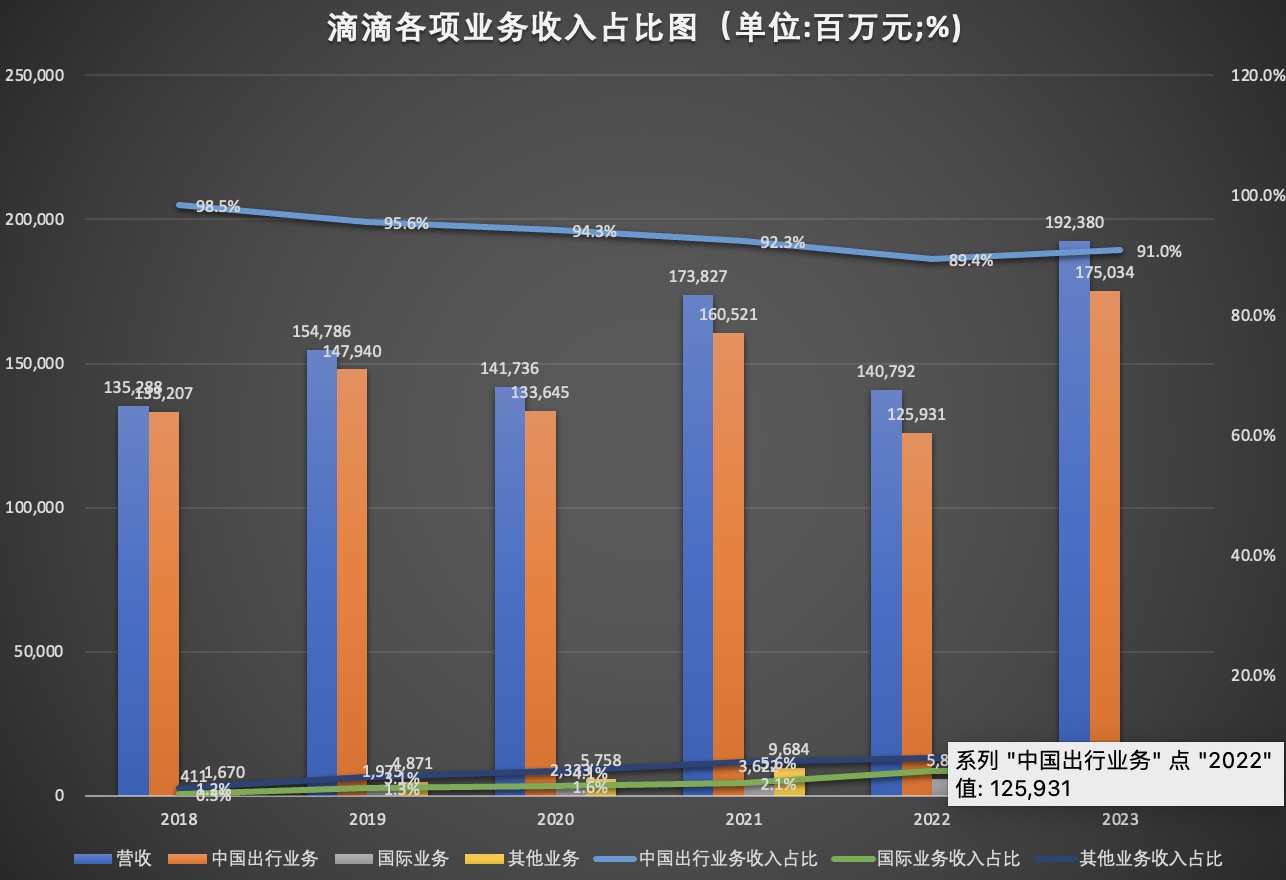 最近三年,滴滴国际化业务实现不错的稳定增长。2023年,滴滴国际业务收入同比增长33.8%至78亿元,2023年第四季度收入同比增长33.3%至22亿元。不过从各项业务收入在总收入中的占比来看,滴滴国际业务体量依旧很小,2023年全年,滴滴国际业务收入在总收入中的占比仅4.1%。