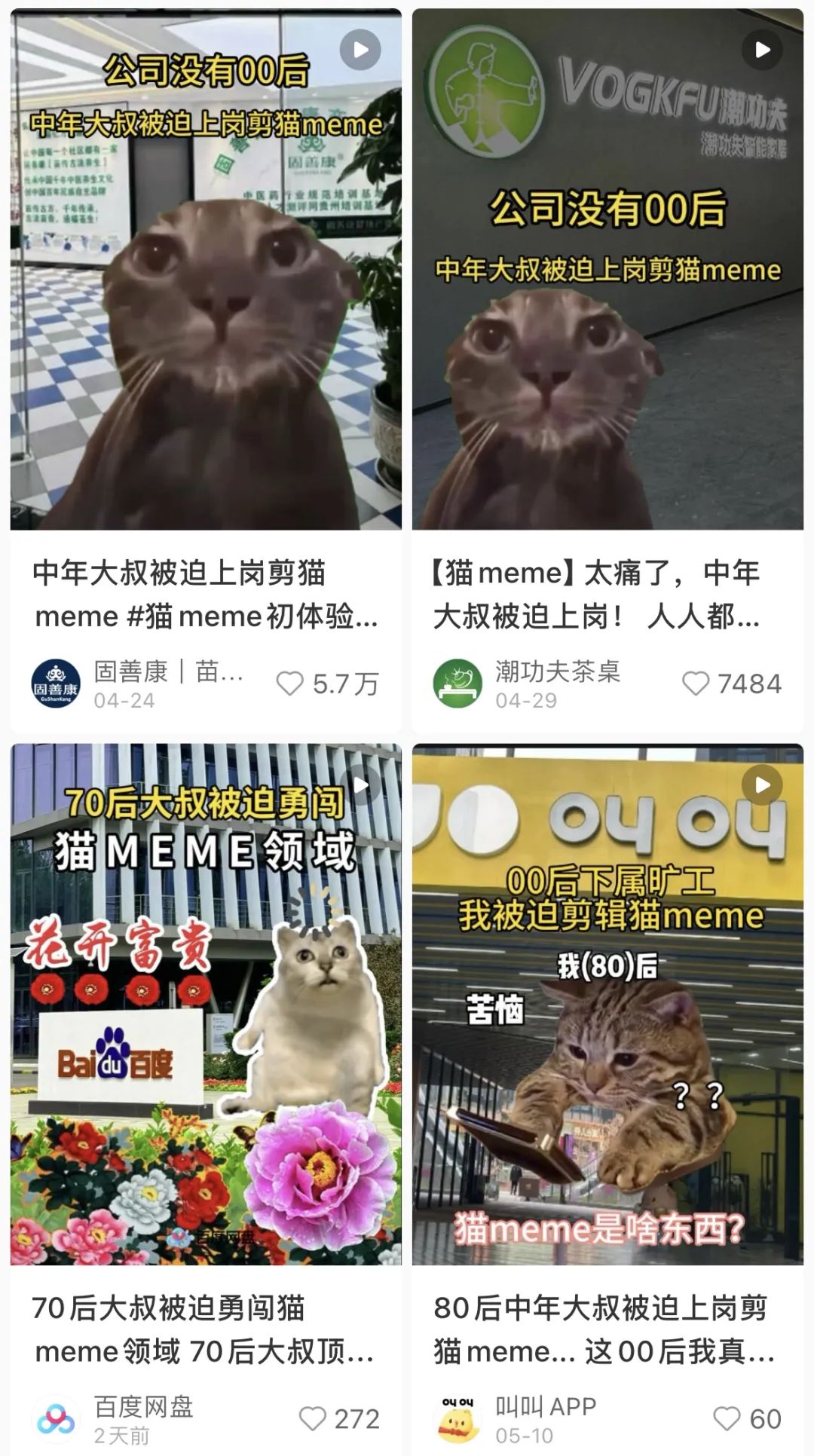 一时间,00后用猫meme运营公司官号成了流量密码。不乏有运营实习生因做猫meme视频一夜爆火,原地转正并开始CPU老板(狗头)。