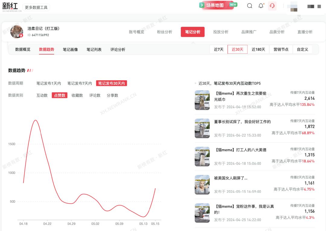 以“洁柔日记(打工版)”的数据表现为例,新红数据显示,近30天内,点赞、收藏、评论等互动数据均有所回落至几百至几千,相比之前点赞破万的爆款笔记有一定差距。
