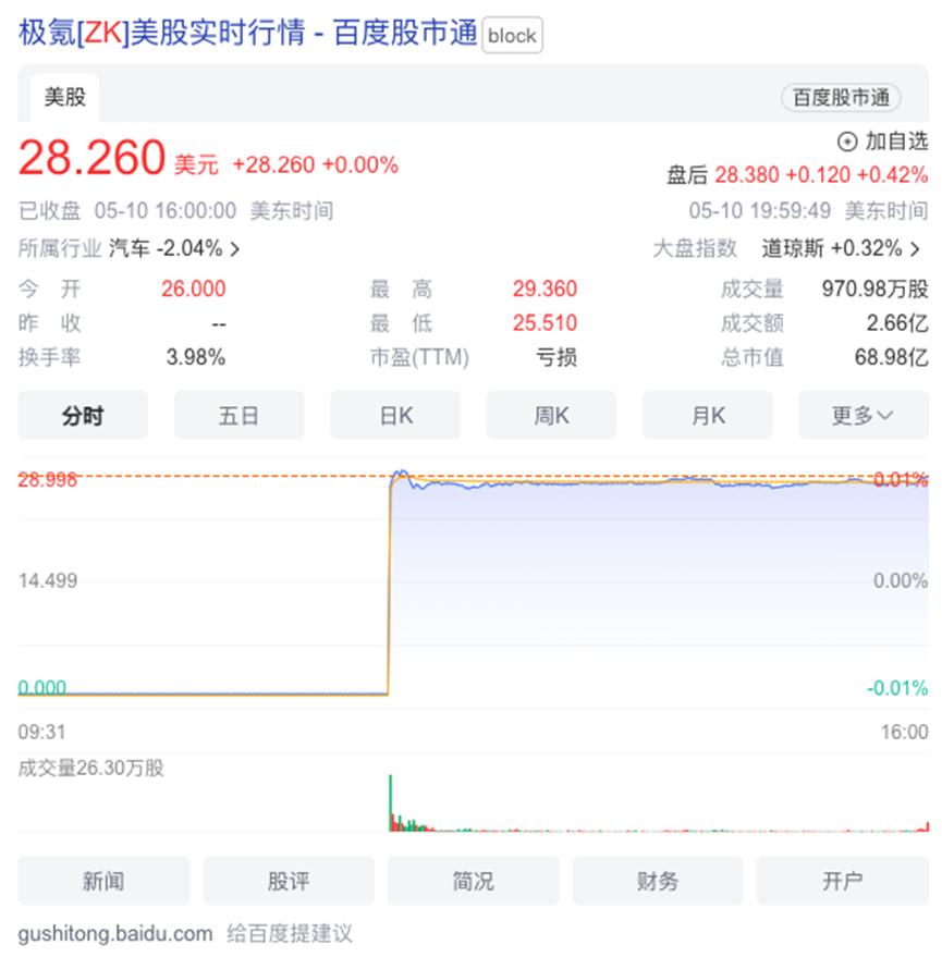 美东时间2024年5月10日,极氪汽车在纽交所挂牌上市。上市首日,极氪以26美元/股的价格开盘,较21美元/股发行价高23.8%,收盘报28.26美元/股,较发行价涨34.57%。