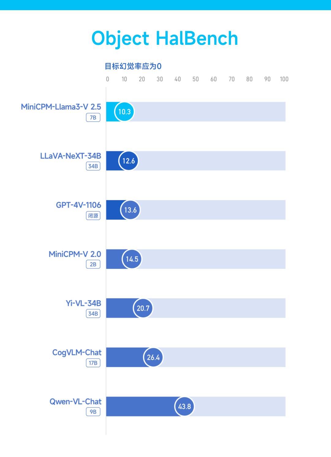 反映到 Object HalBench 的基准测试中,其幻觉率从 MiniCPM-V 2.0(2B) 的 14.5 锐减至 10.3,再次超越 GPT-4 V和 LLaVA-NeXT-34B。