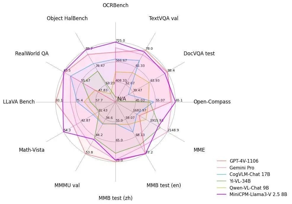在 OCR (光学字符识别)这一综合基准测试中,MiniCPM-Llama3-V 2.5 取得了 725 分的成绩,大幅度远超 GPT-4V,成为超越了Claude 3V Opus 等越级模型。