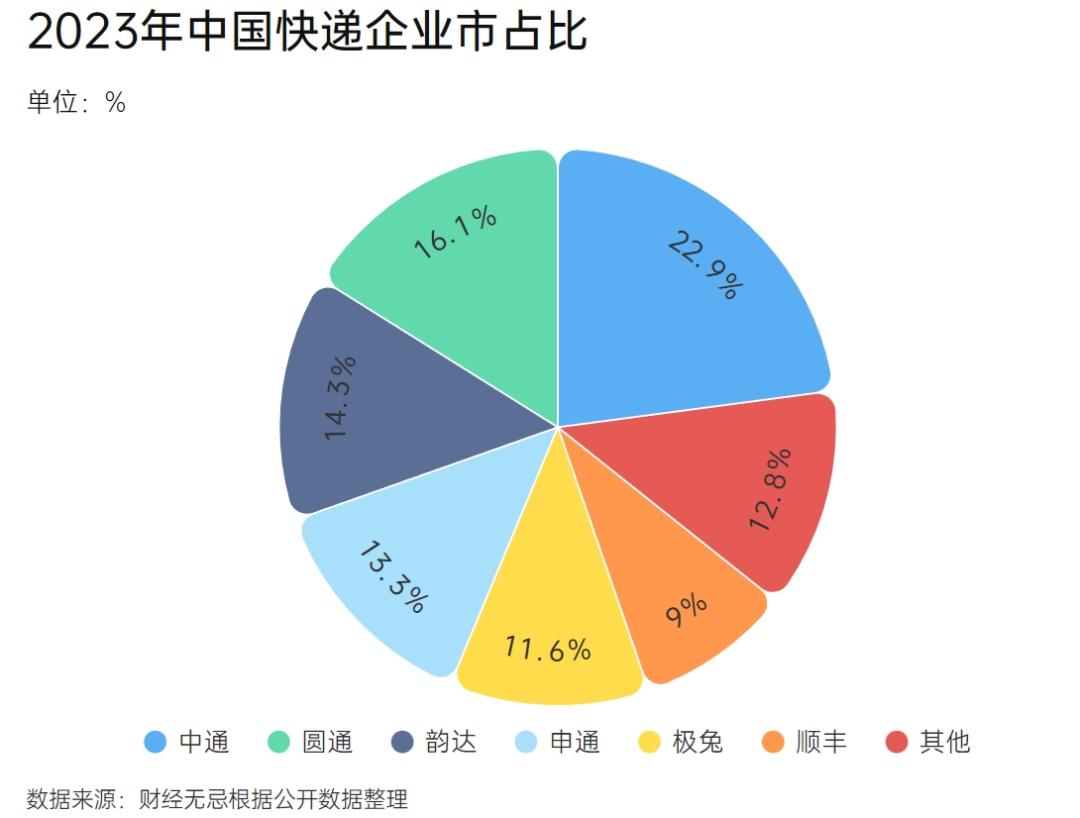 根据公开数据计算,2023年全年,中通、圆通、韵达、申通、极兔、顺丰的市占率分别为22.9%、16.1%、14.3%、13.3%、11.6%和9%。无疑,最先受到冲击的将是韵达。