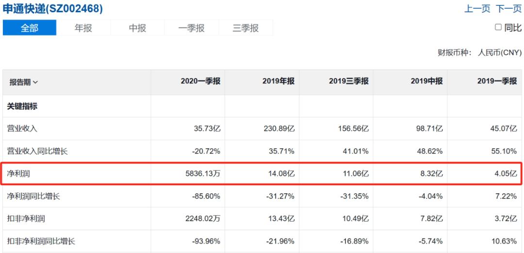 2019年上半年,申通净利同比小幅下滑4.04%;2019年前三季度和2019年底,净利同比下滑分别达到31.25%和31.27%;到2020年前两个季度,这一下滑数据变为85.60%和91.51%。