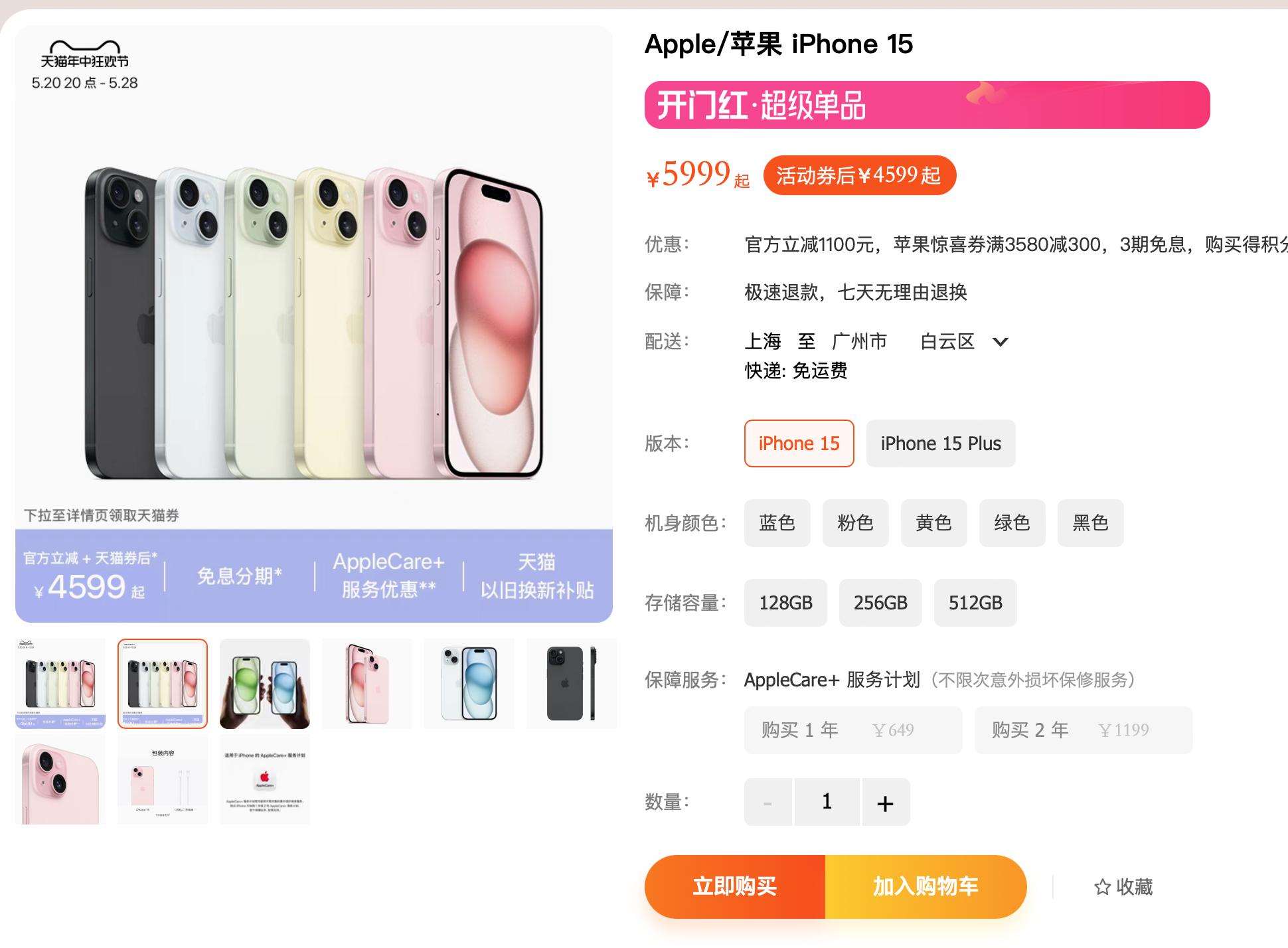 iPhone 15售价4599元起(原价5999元),iPhone 15 Plus售价5599元起(6000元),iPhone 15 Pro售价6099元起(原价7999元),iPhone 15 Pro Max则为7949元起(原价9999元)。令人意外的是,小雷在京东Apple授权店的活动页面发现,iPhone 15活动价为4699元起,意味着这是苹果加入电商平台以来,极为罕见的官方降价幅度高于授权店。