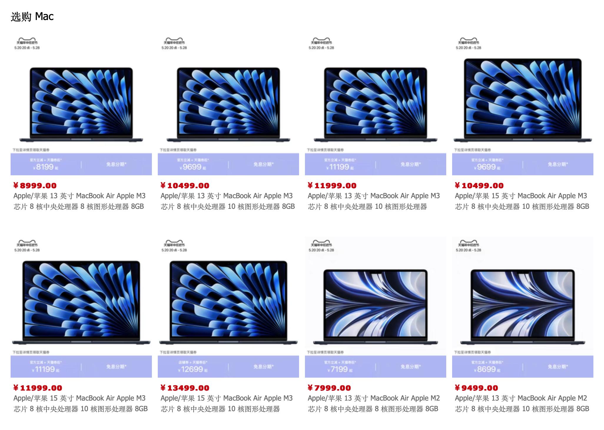 不止是iPhone 15系列,在苹果天猫Apple Store官方旗舰店中,小雷还发现iPhone 14系列、Apple Watch S9/SE、iPad第十代、iPad mini 6、MacBook Air、AirPods Pro第二代、AirPods 第三代这些产品同样参加了天猫618限时优惠活动,如此大规模的降价潮绝对是苹果史上的第一次。