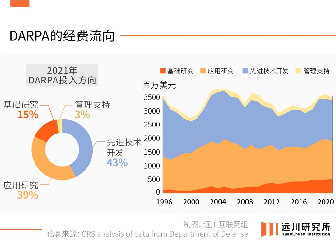 按照DARPA自己的说法,其资金主要投向三个领域:1.基础研究(发现新的科学现象);2.应用研究(针对某领域的突破性技术)3.先进技术开发(产出产品原型及方案)。