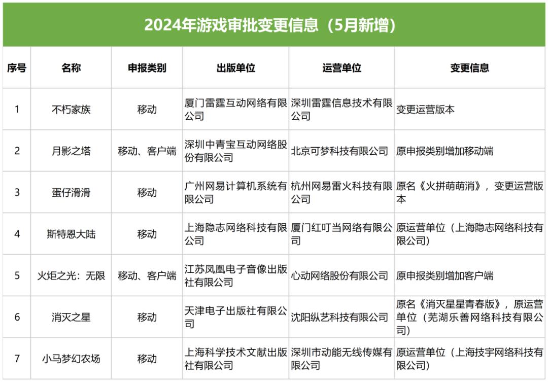 同时,有7款游戏在5月变更审批信息,其中网易《火拼萌萌消》变更游戏版本及变更游戏名为《蛋仔滑滑》、雷霆游戏《不朽家族》变更游戏版本、心动《火炬之光:无限》增报客户端版本。