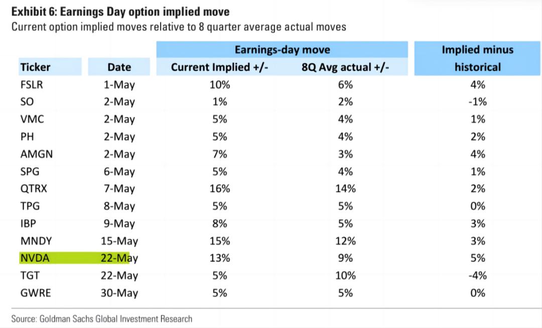 根据高盛最新的期权活动数据,截至到2024年5月1日,英伟达股票对第一季度报告的隐含波动反应约为13%。这意味着,如果英伟达超过市场预期,又或者发布比当前预期更为积极的指引,股价可能上涨约13%。
