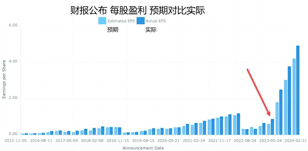 周三美股盘后英伟达会公布财报,我们翻查了英伟达在过去几年的每股收益(EPS)的情况,发现,特别是从2022年11月16日开始,英伟达已经连续5个季度都超预期,你要知道,2022年11月ChatGPT还没出现,真正大爆发是在2023年的春季,时间节点很关键。随后每股盈利开始井喷式暴涨,是之前的2-3倍,原因就是人工智能GPU芯片大卖。