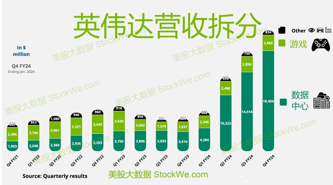 从下图可知,数据中心占比营收从50%,一直飙升到80%,AI仍然是英伟达的主要增长驱动力,并预计今年二季度和三季度数据中心的业绩将受益于对AI相关计算和网络的强劲需求,预计二、三、四数据中心收入季度环比增长分别为10%、17%和5%。