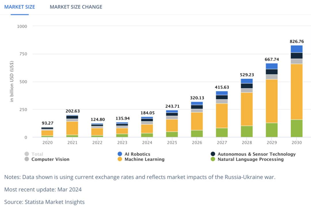 那么,如果只看AI市场呢?2023年,AI市场的规模约为1359.4亿美元,预计到2030年将达到惊人的8267.6亿美元,年均增长率高达28.46%。