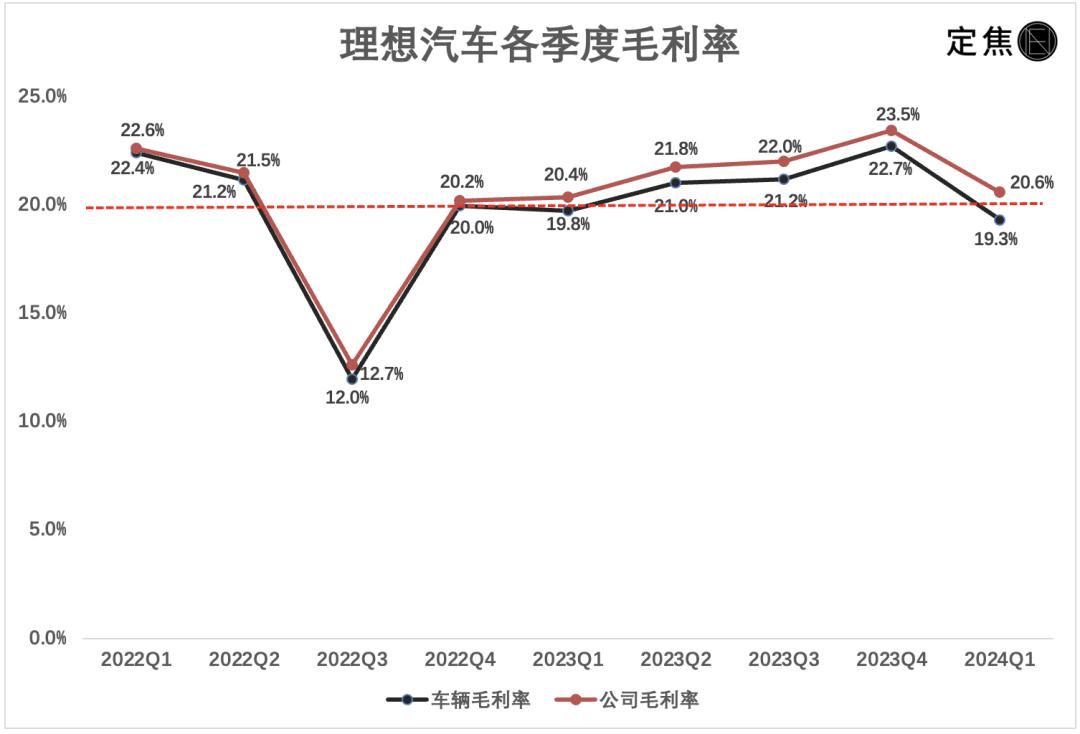 一季度,理想的车辆销售毛利率降到了19.3%,跌破了20%的分界线,公司毛利率降到20.6%,勉强维持在20%之上。
