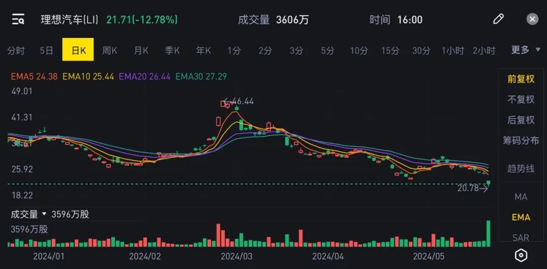 对于二季度,理想给出的销量指引是10.5万辆至11万辆,4月份理想交付了25787辆,这意味着5月和6月的月交付量要达到4万辆左右。这个指引低于市场预期,导致理想在财报发布之后股价大跌。