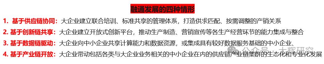 (四)基于产业生态开放。 在这种模式下,大企业以自身业务为引领,带动包括各类与大企业业务相关的中小企业在内的供应链产业链集群的生态化和专业化发展,打造覆盖产学研的经济网络,加速区域内外大中小企业创新能力、生产能力、市场能力的有效对接,推动资源能力的跨行业、跨区域融合互补,提升产业协同效率,形成具有开放性的线下集群和线上生态。产业生态开放融通的模式一般发生在平台化、生态化发展为主的大企业及其生态伙伴中小企业之间。