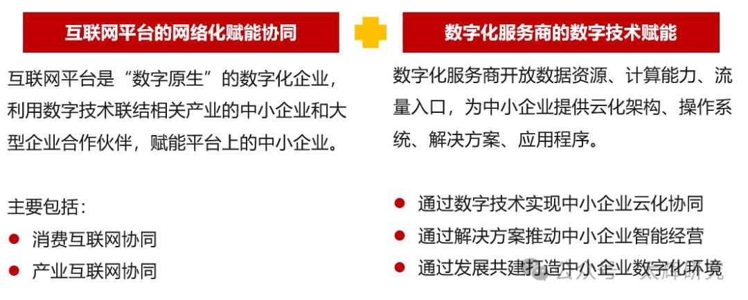 (一)互联网平台打造网络化赋能协同模式。 互联网平台是“数字原生”的数字化企业,利用互联网、云计算、区块链等数字技术,联结相关产业的中小企业和大型企业合作伙伴,利用自身经营业态网络赋能平台上的中小企业。 互联网平台的网络化赋能协同模式又可分为消费互联网协同、产业互联网协同两大类。