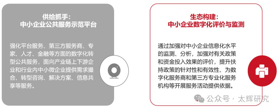 (二)实施中小企业数字化评价与监测。 政府通过对中小企业信息化数字化水平的监测分析,加强对有关政策和资金投入效果的评价,提升扶持政策的针对性和有效性,为数字化服务商和第三方专业服务机构等开展信息化、数字化服务提供支撑。