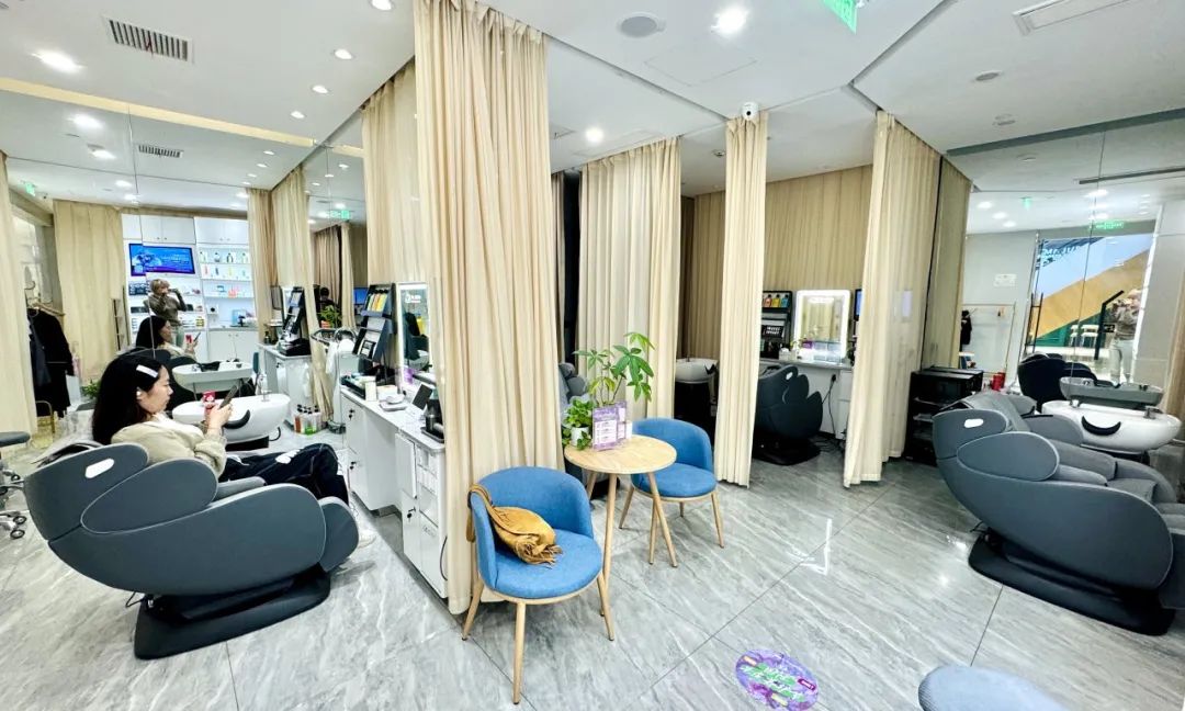 店员会先为你做个头皮检测,放大你的发质和头皮屑,再让你在按摩椅上躺下,边按摩边洗头。这项服务的定价在自动按摩椅和人工按摩服务的“中间地带”,对上班女性来说,具有独特的“性价比”。