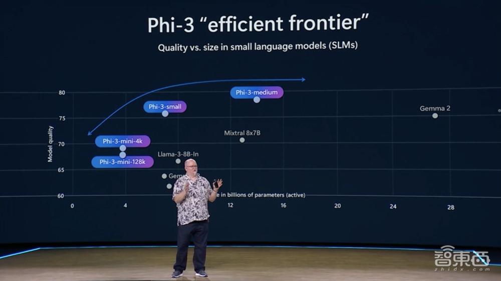 再来看看小模型。小模型运行所需的计算成本更低,但更适合在设备上运行,这通常意味着质量缩水。但微软在过去一年发现了一个高效前沿(Efficient Frontier),也就是小模型在场景中实现的质量变得相当高。