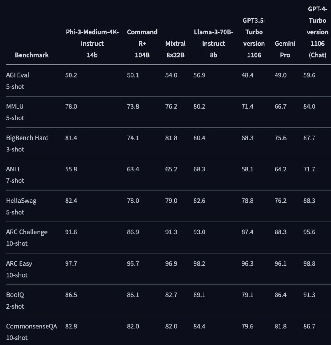 从基准测试来看,最强开源模型大有易主之势。中杯Phi-3-Medium以14B的参数,性能逼近混合专家模型Mixtral 8x22B和70B参数的Llama 3。