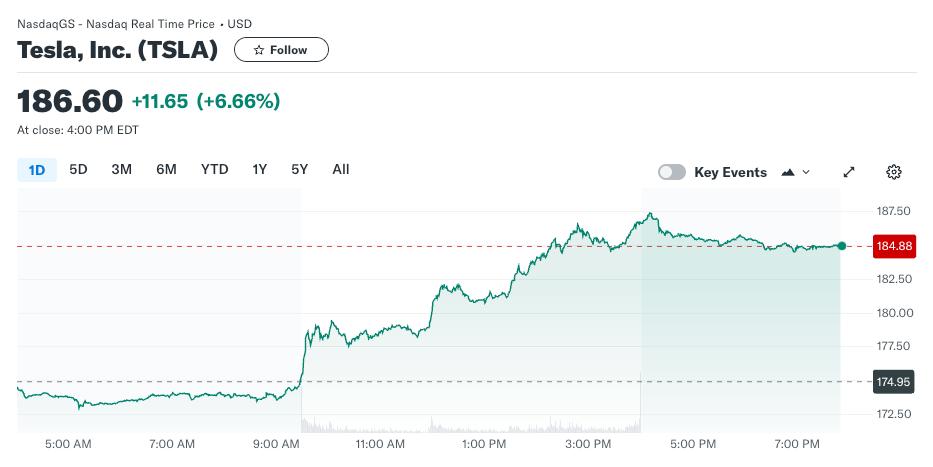 今天特斯拉在美股七姐妹中表现最佳,收涨6.66%至每股186.60美元。在周一回落后反弹至4月29日以来收盘高位。