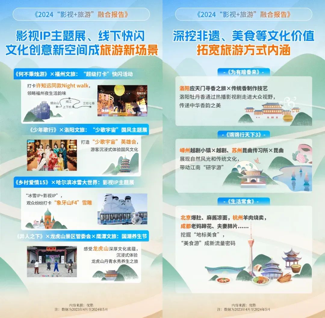 5月19日,优酷发布了《2024“影视+旅游”融合报告》(以下简称《报告》)。《报告》显示,自去年开始,影旅融合带火地方旅游业,带动游客、收入双增长;县域“追剧游”持续升温,微短剧成新乡村文旅指南;影视IP主题展、线下快闪等文化创意新空间成旅游新场景。