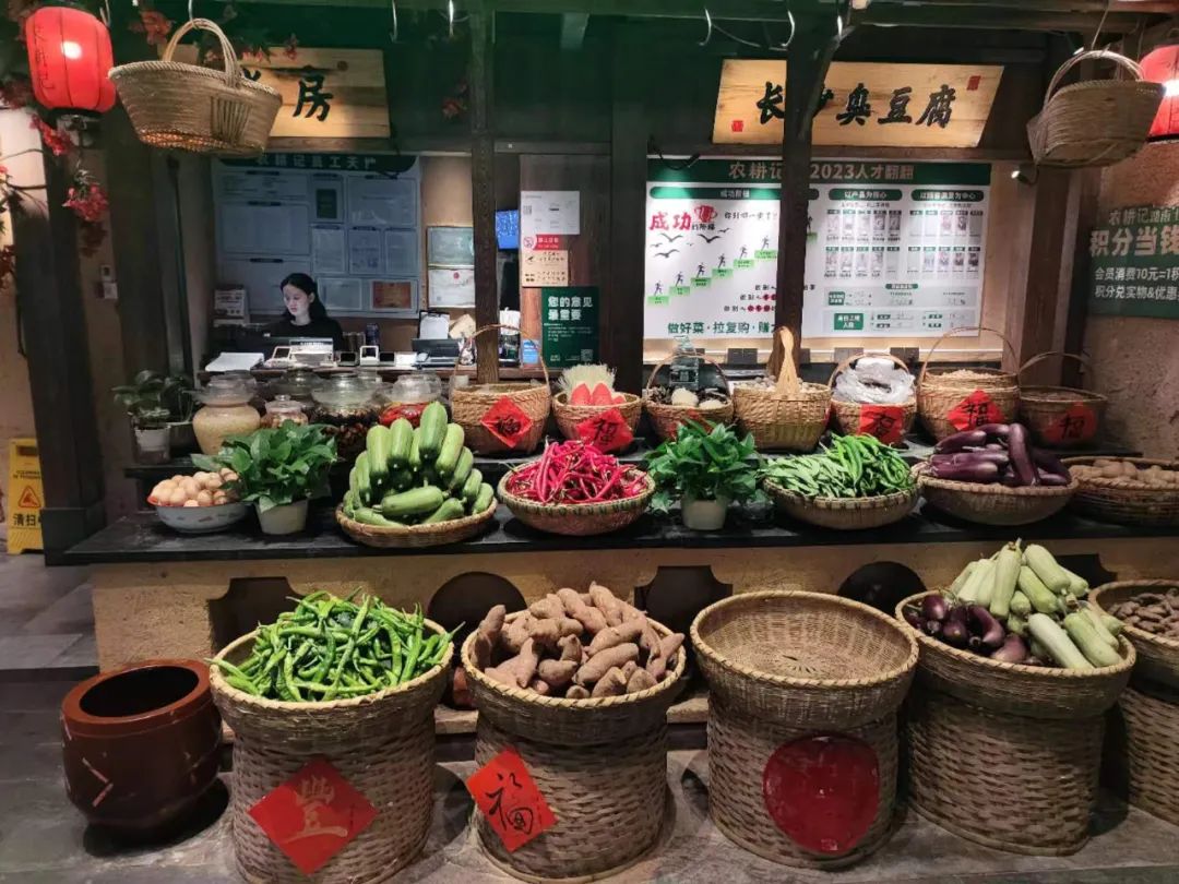 典型如农耕记,餐厅一进门就是食材展示区,从土鸡蛋到腊肉,从新鲜蔬菜到辣椒等干货,都是来自湖南各地的食材。就连盛放食材的工具也颇为讲究,都是湖南农家常见的缸、竹筐、小簸箕等。
