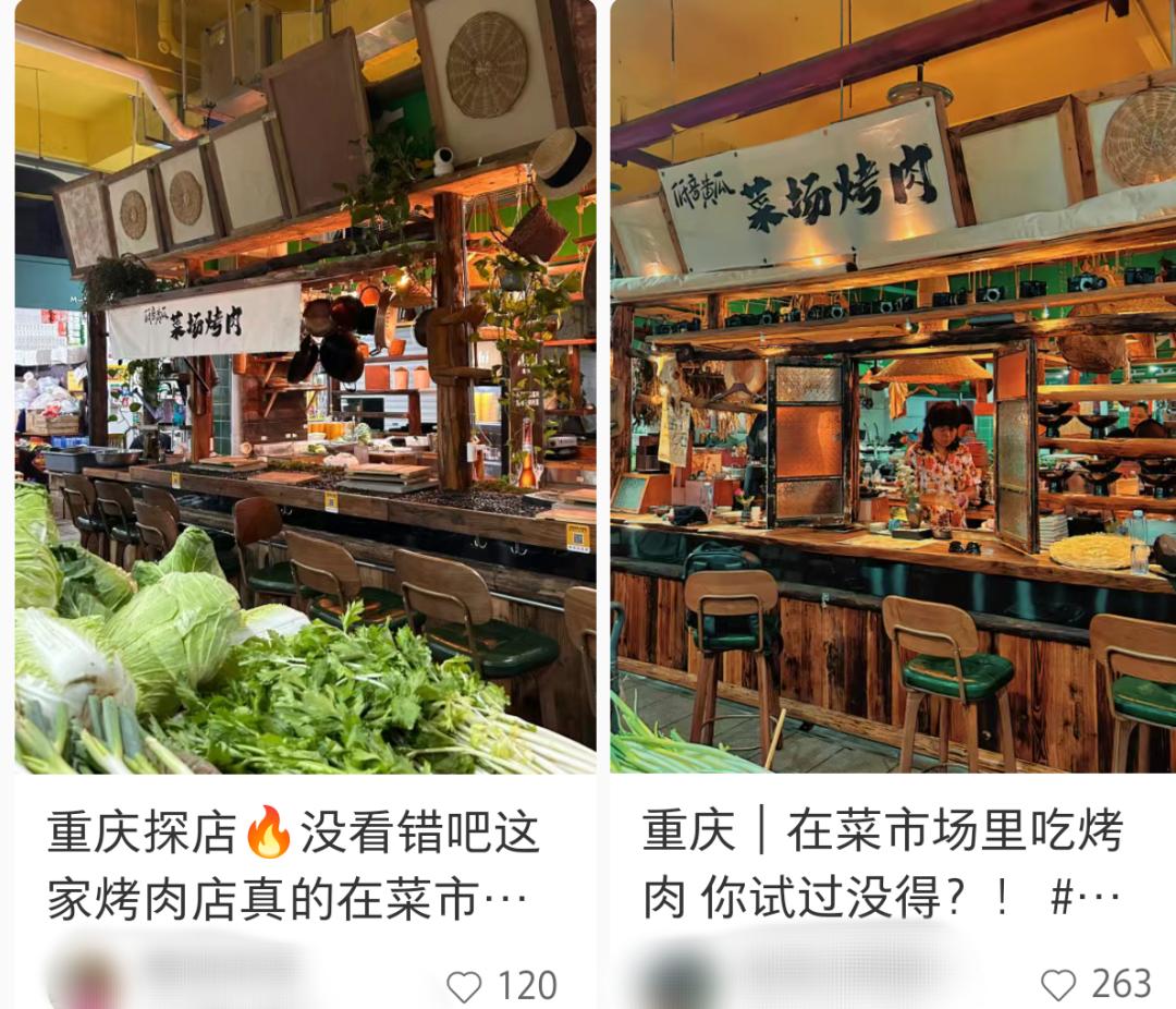 比如位于重庆九一综合菜市场的“低音黄瓜·菜场烤肉”,老板直接将店开在了菜市场中心。店内空间全部打通,顾客就餐区被售卖蔬菜、水果等食材的摊位包围着,店铺的装修风格也试图与菜市场的市井气融合,比如木质的桌椅、悬挂起来的锅具、一些竹篾元素的装饰品等。