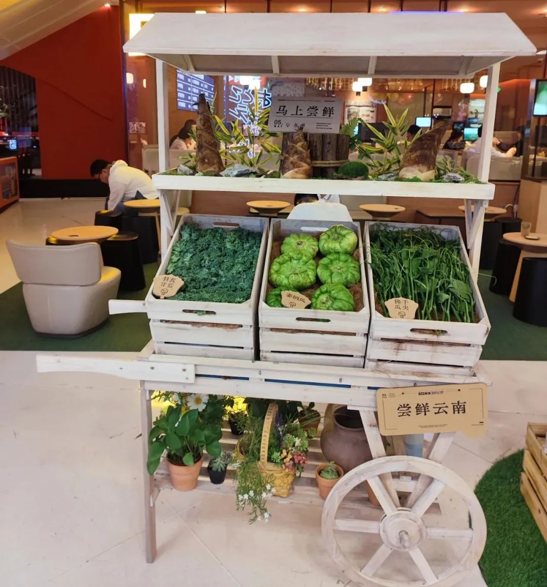 最近,巴奴毛肚火锅就搭上了食材集市的风。巴奴在不少门店前加了一辆小推车,用盛满泥土的框装着鲜竹笋、姜柄瓜、佛手瓜尖、羽衣甘蓝等云南特色食材。