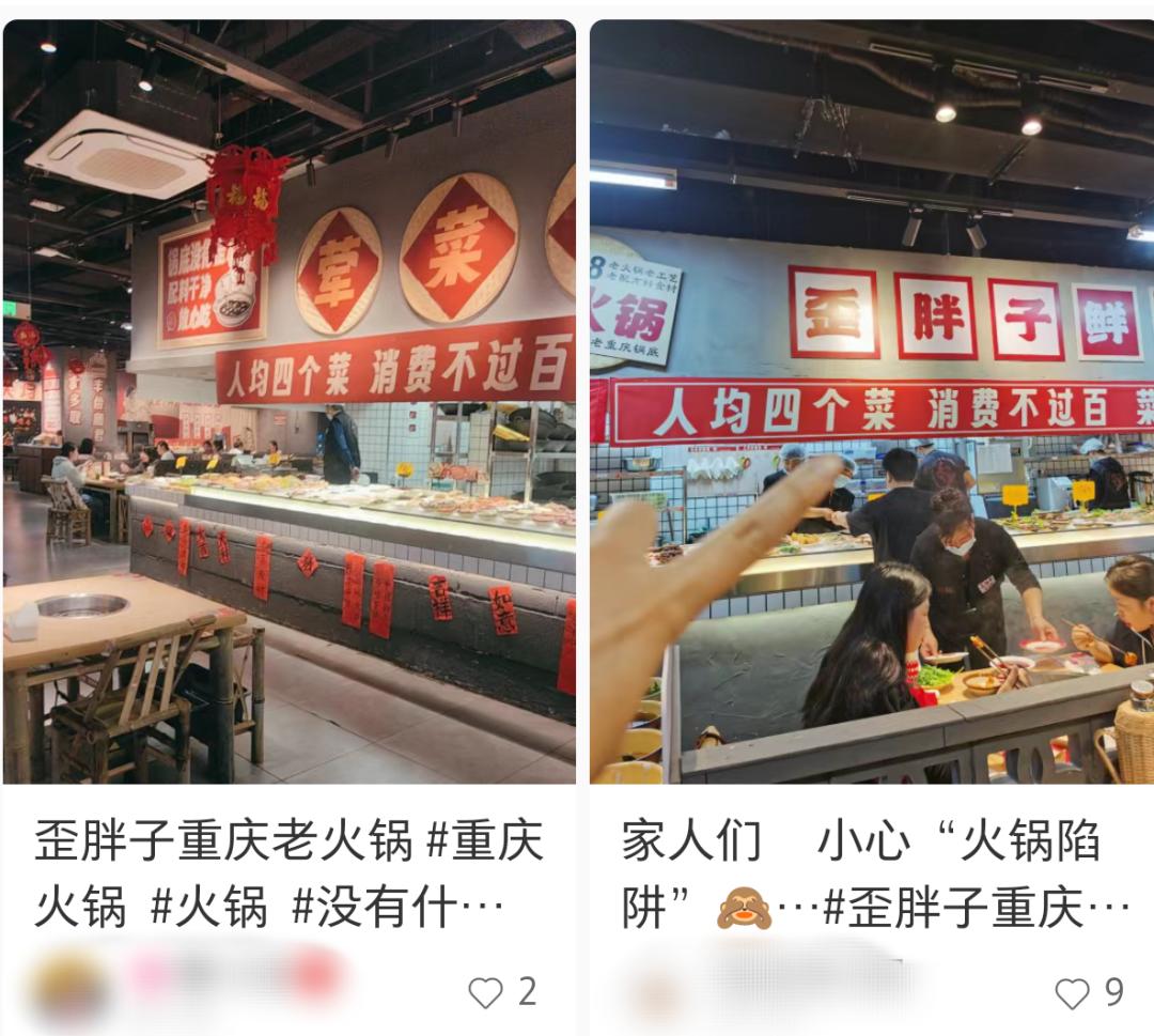 在江苏一家名为歪胖子重庆老火锅店,顾客一进来就能看见长长的一条自选台,上面陈列着数十种食材,往里走依次为甜品区、肉类区、菌类区、蔬菜区等,不同菜品装好盘并标注了价格,供顾客自行选择。