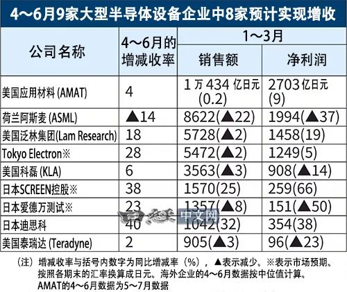 其他企业也出现了明显的触底反弹迹象。从企业预测的中间值和市场预测平均值来看,4~6月(目前已进入该季度),除荷兰阿斯麦控股(ASML Holding)外,其他8家企业的收入将同比增加。