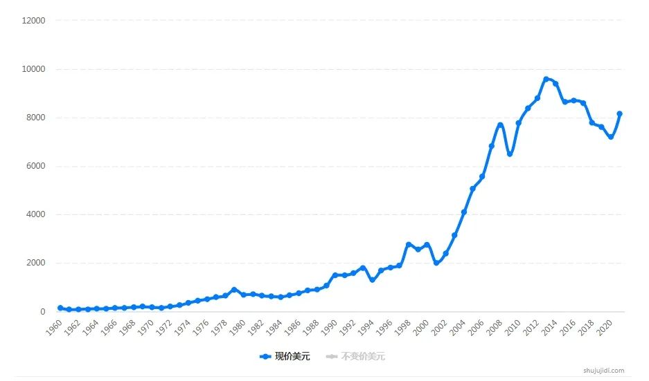 1960-2020年土耳其的GDP走势