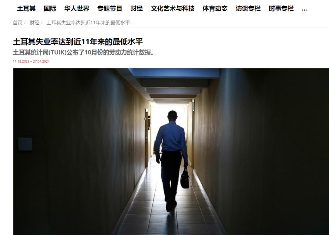 2023年11月的时候,土耳其国营广播公司(TRT)有一篇报道,标题是《土耳其失业率达到近11年来的最低水平》。