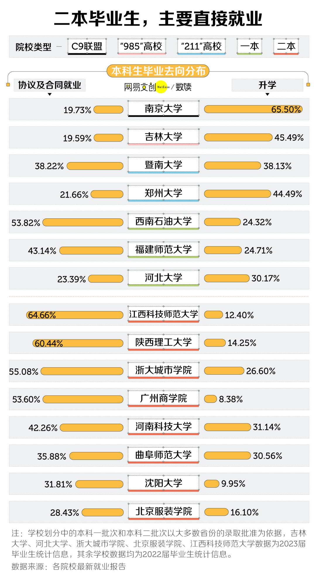 但据我们整理的就业数据来看,二本院校的升学率和重点院校相距甚远,多数二本的升学率在 20% 以下,除了像曲阜师范大学那样的“考研神校”,升学比例会更高一些。