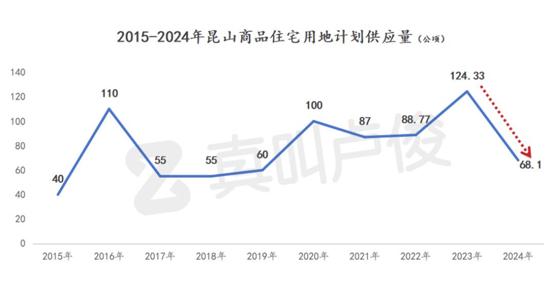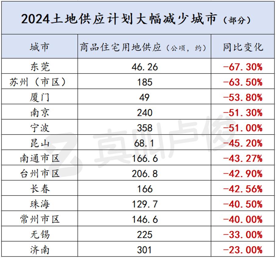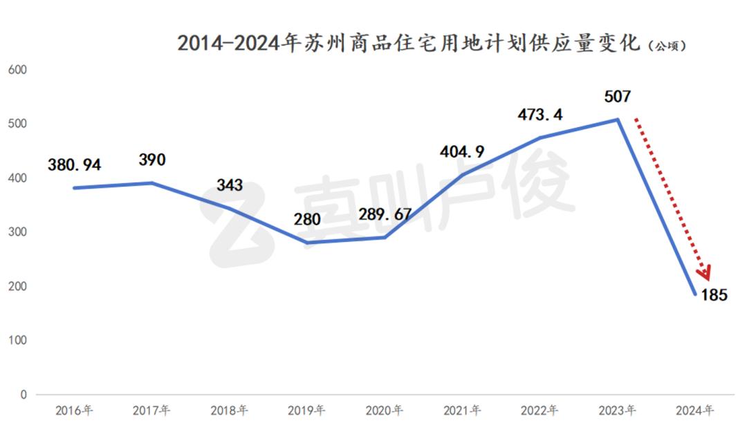 苏州(市区)2024年商品住宅用地供应仅为185公顷,同比去年降幅超过63%,可以说是断崖式下跌 。