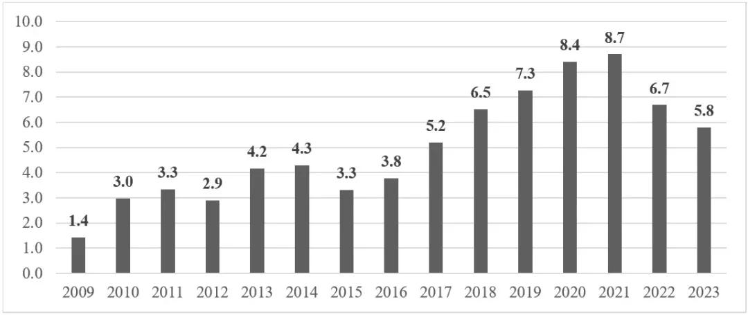 全国卖地收入最高点在2021年,卖地收入达到约8.7万亿元,2023年降至5.8万亿元 。