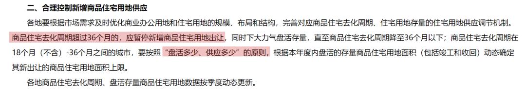 要求商品住宅去化周期超36个月的城市暂停新增用地出让 。