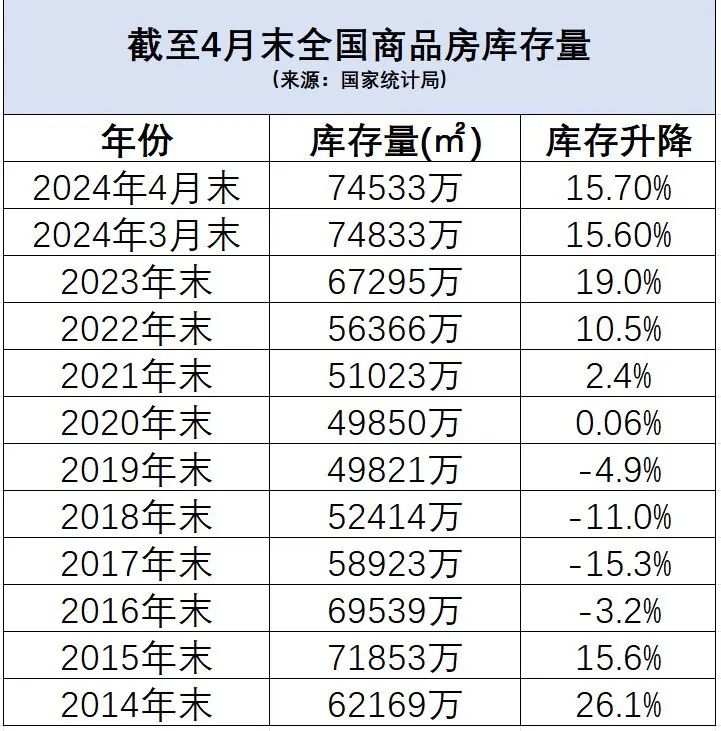 截止2024年4月末,全国商品房的库存量高达74533万平方米,同比增长15.7%,远远超出了前几年的水平 。
