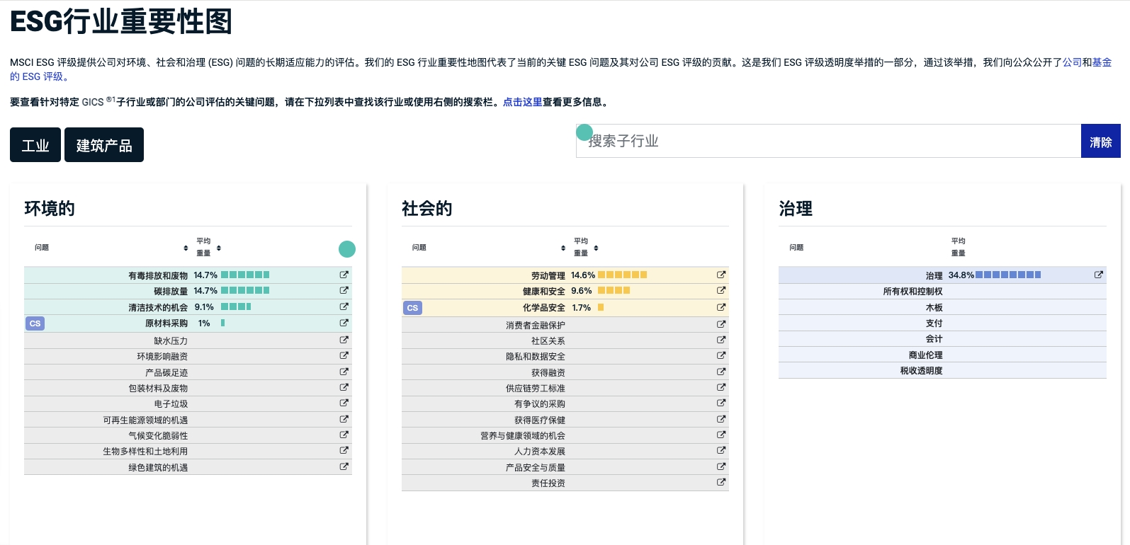 可以看出,企业首先要厘清自己的关键议题是什么。根据MSCI公布的框架,ESG评级共包含33个关键议题。MSCI评级强调行业特性,企业可以在“行业重要性地图”中设置搜索条件,精准查询某个具体行业的关键议题和权重。例如36碳检索了工业领域的建筑行业,有害废弃物排放和碳排放、劳动管理和治理,是该行业权重较高的关键议题。