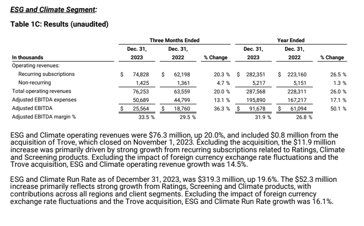 优秀的财务业绩,也印证了MSCI的ESG业务在稳健增长。财报显示,2023全年MSCI的ESG和气候业务,营收接近3亿美元,增长26%;排除外币汇率波动和收购行为影响,ESG和气候业务的运行率增长16.1%,主要源自评级、气候产品等强劲表现。
