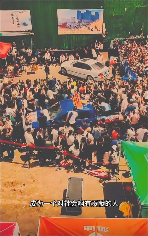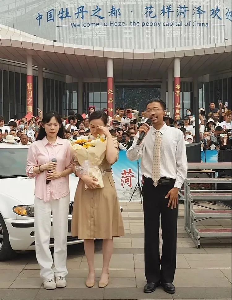 5月19日中午,山东菏泽南站,人山人海,尖叫声此起彼伏;直播间里,一首《感恩的心》适时响起, 镜头转向空中,白色的建筑上写着“牡丹之都 花样菏泽欢迎你”,旁边围满了观众,再远处则是各式各样的帐篷。