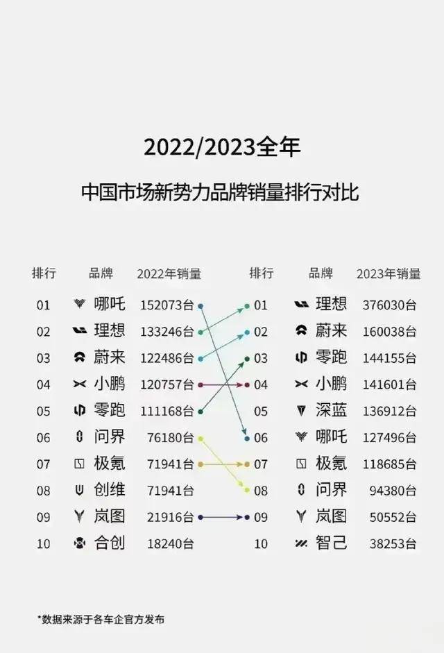 不过在2023年,哪吒汽车也迅速从巅峰跌落,一举沦落成为最“惨”的造车新势力,全年销量不升反降,不仅是唯一一家销量下滑的主流新能源车企,同时销售目标完成率也在新势力中排名垫底。