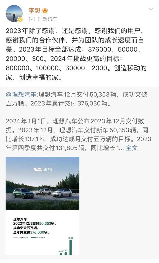 2023年的理想汽车,无疑是造车新势力中风头最盛的一家,创始人李想在社交媒体上频频指点江山,被封为车圈的“微博之王”,理想各系列车型也在市场上大杀四方,全年共交付新车 376030 辆,同比增长达到了惊人的182.2%。