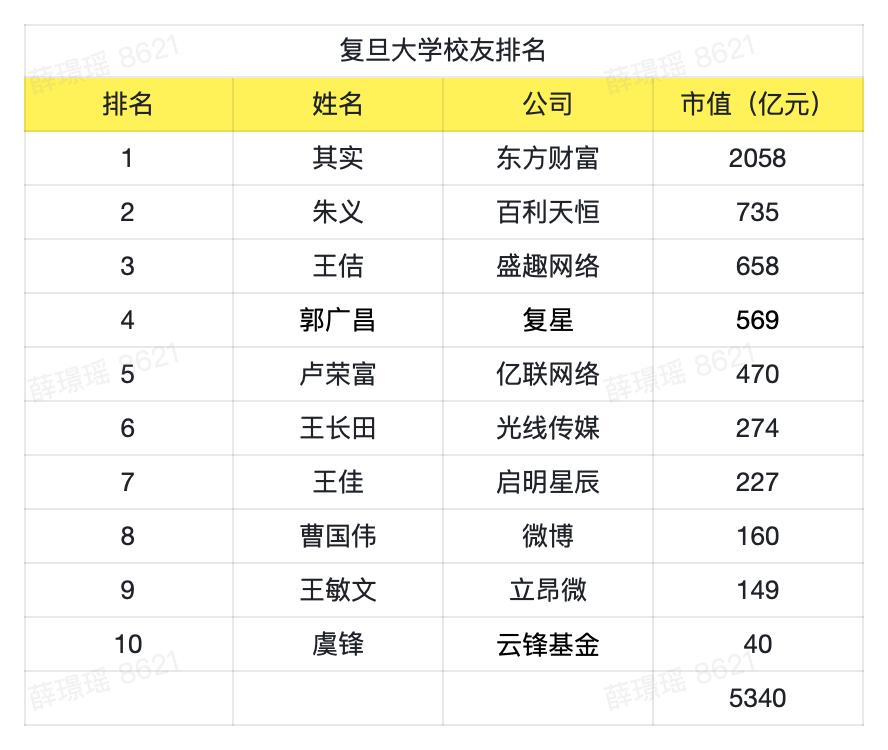 复旦大学校友的上市公司中,东方财富以2058亿的市值领跑复旦校友企业,成为唯一一家市值超过千亿的公司。而排名第二的百利天恒市值则仅为735亿,差距显著。排名第十的云锋基金市值更是低至40亿。复旦校友企业前十名的总市值仅为5340亿,目前看来相对偏低。