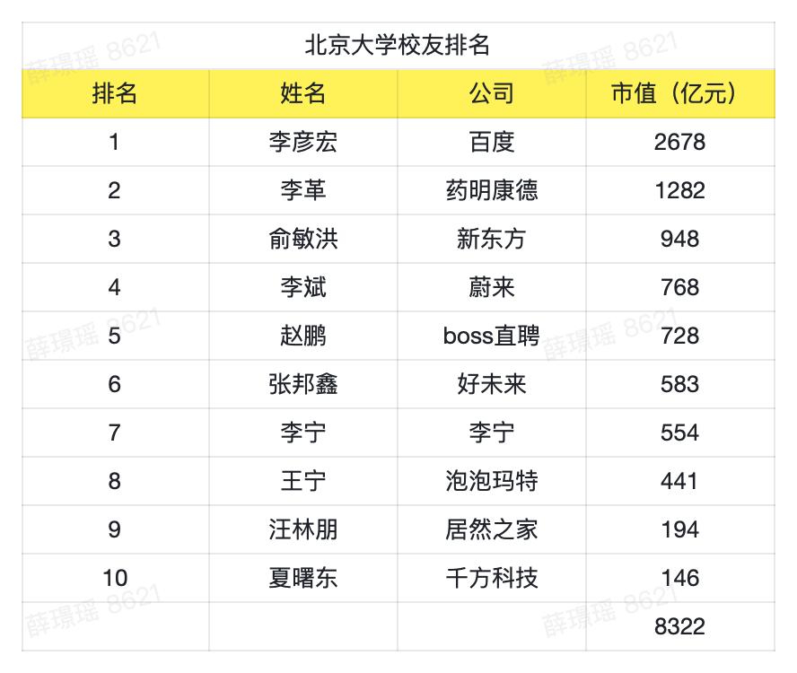 接下来,我们来看北京大学。百度作为北大校友企业的领头羊,市值达到2600亿。药明康德则以1282亿的市值紧随其后。然而,与清华大学相比,北大校友企业中市值超过千亿的仅有两家。新东方目前的市值已下滑至948亿,排名第三。而第十名的千方科技市值仅为146亿。这十家公司的总市值合计为8322亿,虽然不俗,但与清华相比仍有一定差距。