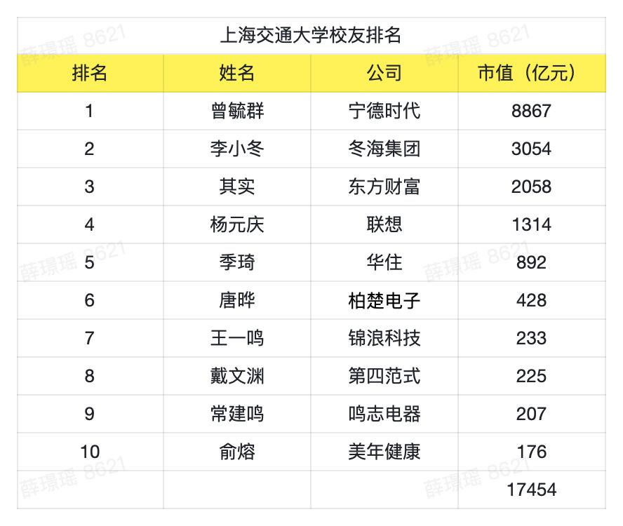 上海交通大学的校友企业实力不容小觑。其中,宁德时代以惊人的8800亿市值稳坐榜首,作为新能源电池领域的佼佼者,影响力不容置疑。紧随其后的冬海集团,被誉为东南亚的“小腾讯”,市值达到3000亿,实力同样强劲。排名第四的联想,市值1300亿,也显示出上交校友在科技和商业领域的卓越表现。上海交通大学校友企业中共有四所市值破千亿的公司,即使是排名第十的美年健康,市值也达到了176亿。这十家公司的总市值高达19,961亿,充分证明了上交校友在商业领域的非凡实力。