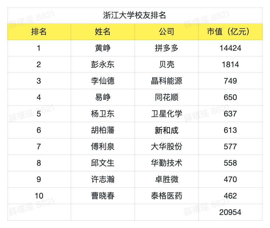 浙江大学这所拥有127年历史的学府,在商业领域同样展现了非凡的成就。黄峥的拼多多公司,市值高达14,424亿,不仅荣登浙江大学校友企业榜首,更是五个排行榜中的佼佼者。紧随其后的是贝壳,市值1,844亿,尽管与拼多多有一定差距,但依然展现出不俗的实力。浙江大学校友企业中,市值超过1000亿的仅有两家,但接下来的一系列公司同样表现出色,如排名第10的泰格医药市值也有462亿。