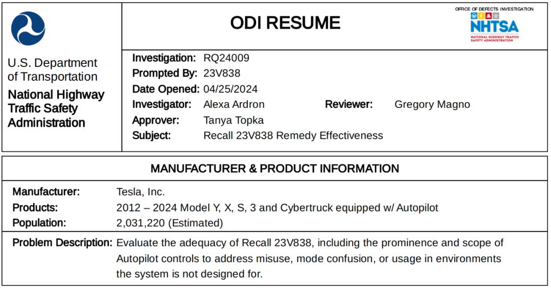 NHTSA透露,它正在启动一项新调查,以评估特斯拉去年12月对超过200万辆汽车实施的召回修复,是否确实足以解决围绕其Autopilot驾驶员辅助系统的安全问题。